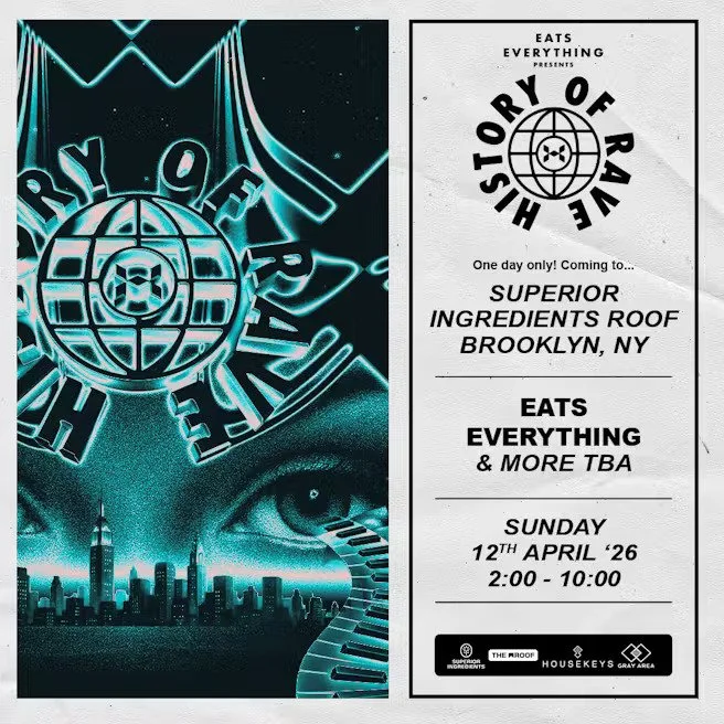 Eats Everything: History Of Rave Sunday, April 12, 2026 2:00 PM 10:00 PM Superior Ingredients 74 Wythe Avenue Brooklyn, NY, 11249 United States (map) Google Calendar ICS TICKETS TABLE SERVICES This is a 21+ event | Valid ID must be shown at doorFor details on our policies see our FAQ