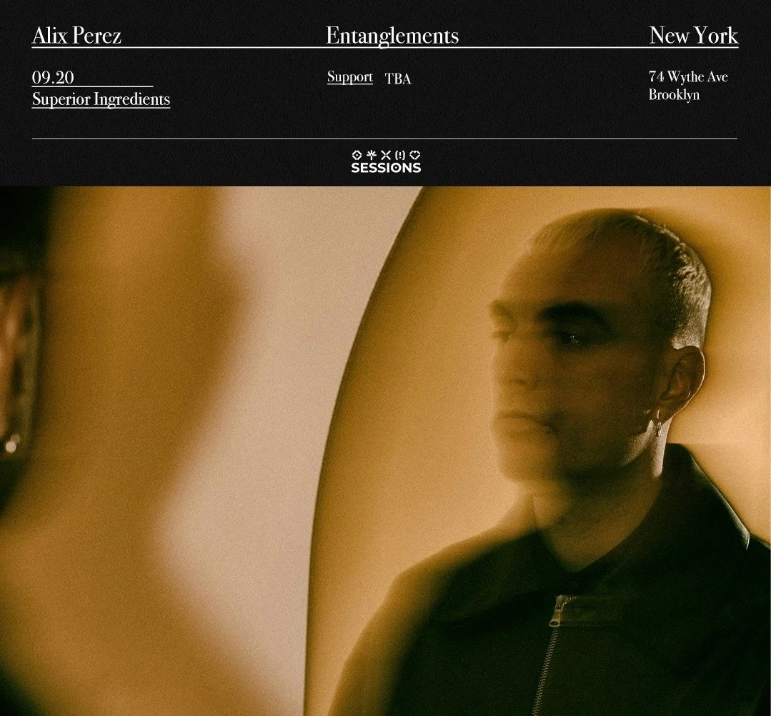 Entanglements: Alix Perez Friday, September 20, 2024 10:00 PM Saturday, September 21, 2024 4:00 AM Superior Ingredients 74 Wythe Avenue Brooklyn, NY, 11249 United States (map) Google Calendar ICS TICKETS TABLE SERVICES This is a 21+ event | Valid ID must be shown at doorFor details on our policies see our FAQ
